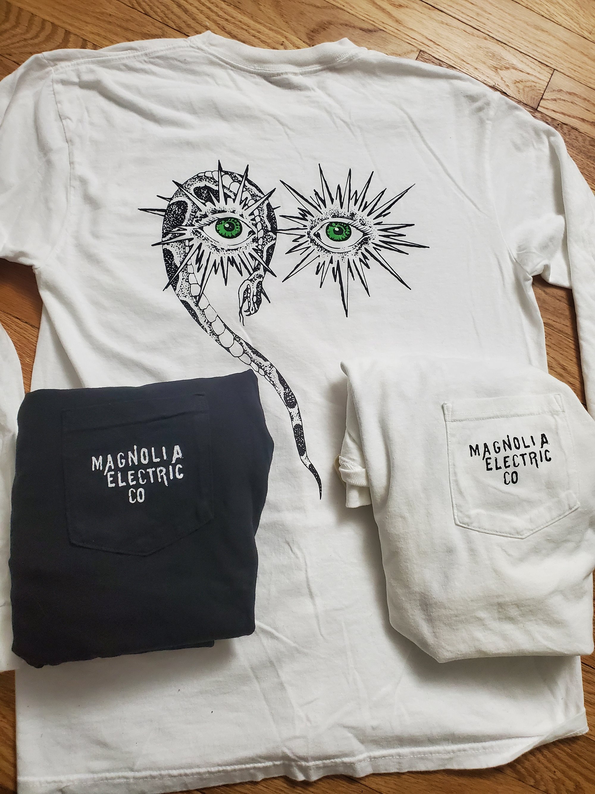 Long sleeve. Front chest pocket. Comfort colors. Black or white. Art by J. Adams.